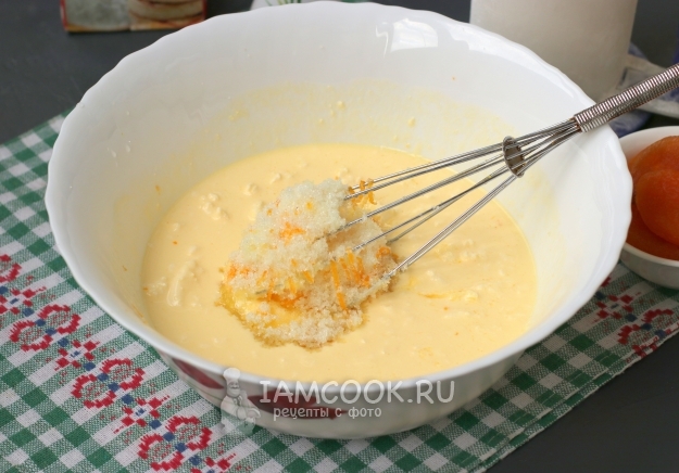 С апельсина снять цедру и смешать её с сахаром, затем добавить эту смесь в миску к остальным ингредиентам.