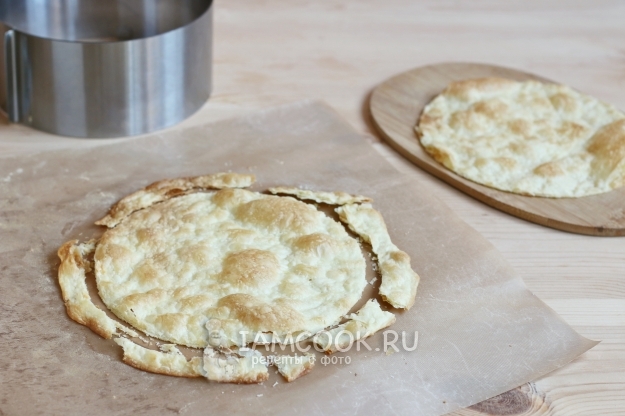 Пока крем остывает, испечем коржи. Делим тесто на 8 частей, уберем их снова в холодильник, будем доставать по одной, раскатывать тонко и выпекать при 180 градусах примерно 7-8 минут, ориентируясь на румяный цвет. После выпечки сразу обрезаем корж кольцом до необходимого нам диаметра в 18,5 см. Все обрезки от коржей сохраняем - потом измельчим и используем для обсыпки готового торта.