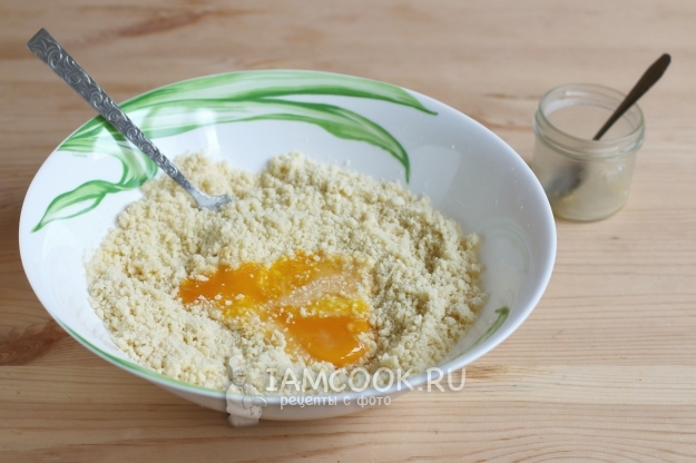 Когда мука с маслом в процессе смешивания приобретут консистенцию крошки, добавляем куриные желтки и смешиваем.