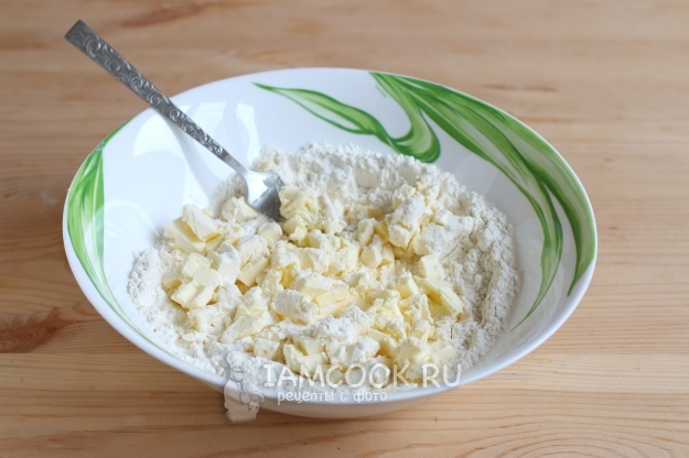 Муку просеиваем в широкую емкость и добавляем к ней нарезанное кубиком холодное масло. Вилкой начинаем разминать масло, смешивая его с мукой.