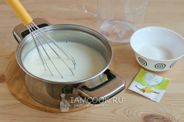Молоко доведем до кипения, потом добавим половину нормы сахара и ванилин, размешаем, чтобы сахар растворился.
