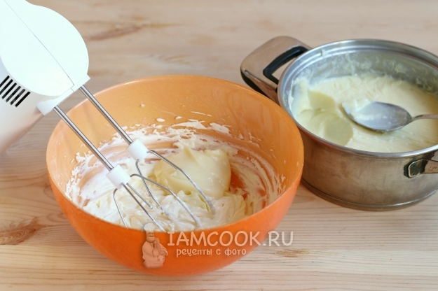 После выпечки всех коржей заварной крем остынет и еще больше загустеет. В принципе, можно промазать коржи просто заварным кремом, если у вас нет жирных сливок или вы не хотите добавлять масло. Я сделала с добавлением масла. Для этого масло доведем до комнатной температуры, выложим в миску и начнем взбивать миксером до посветления и пышности, это примерно 3 минуты, потом добавим сахарную пудру и взобьем еще минуту. После этого добавляем понемногу заварной крем, взбивая после добавления каждой порции, и так до полного объединения.