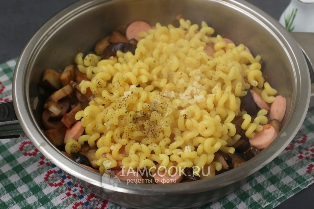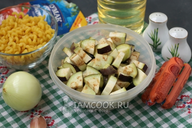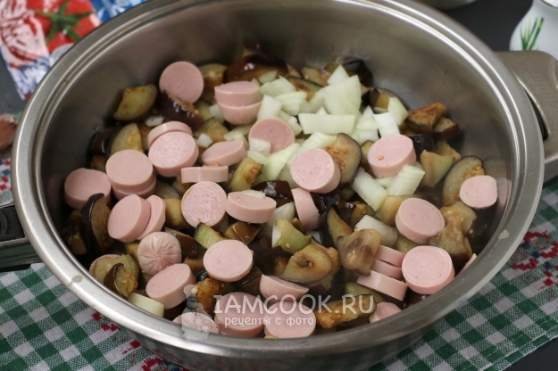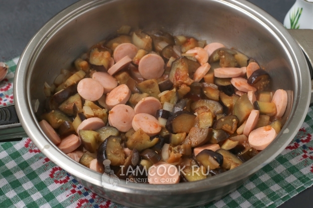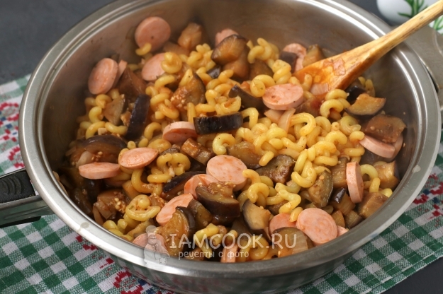 Затем к баклажанам добавить лук и нарезанные сосиски, перемешать и готовить 5-7 минут. Параллельно сварить до состояния аль-денте макароны в подсоленной воде.
