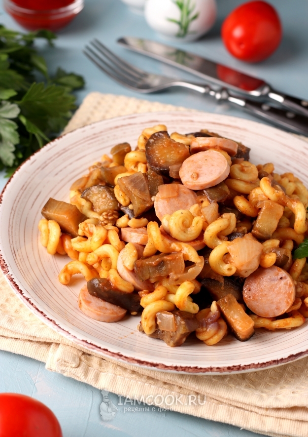 Если вам надоело готовить банальные макароны, то можно приготовить их в томатном соусе с сосисками и баклажанами. Такое блюдо будет сытным и вкусным, и мы получим сразу гарнир, подливу и закуску. Подойдут разнообразные макаронные изделия, такие как пенне, фузилли или феттучине. Мой выбор в этот раз пал на каватаппи или попросту спирали. Получилось очень вкусно!