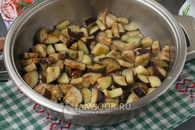 В сковороде разогреть растительное масло. Баклажаны протереть от соли, выложить в сковороду и обжарить. Это займёт около 8-10 минут.
