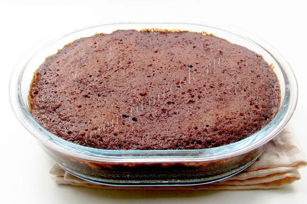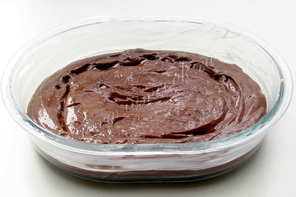 Переложите тесто в форму, сделав углубления посредине, как показано на фото. Это нужно для того, чтобы бисквит не поднялся горбом, а был ровным.