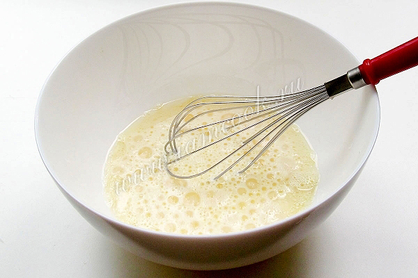 В миску разбейте яйца, смешайте их с сахаром, маслом, добавьте молоко или сливки.