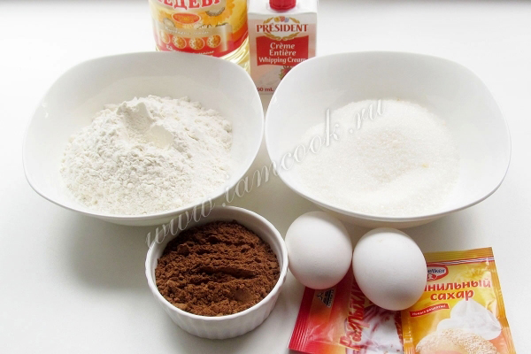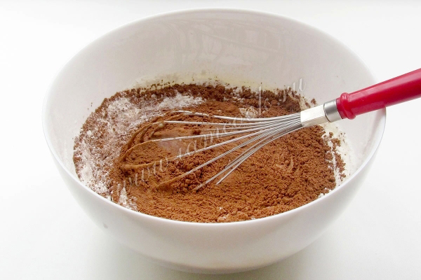 Затем добавьте сухие составляющие- какао, разрыхлитель, ванилин и муку. Муку добавляйте постепенно, до нужной густоты теста.