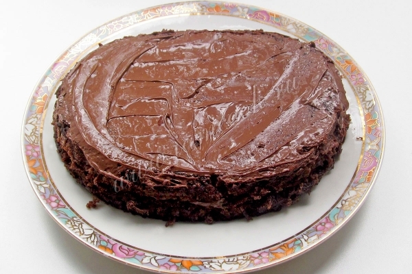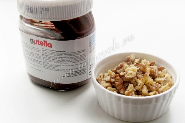 Крем для этого торта может быть абсолютно любым - просто варенная сгущенка, варенье, конфитюр, растопленный шоколад со сливками, заварной крем. Мне захотелось сделать его еще более шоколадным и смазать шоколадной пастой. Орехи грецкие я использовала для украшения и обсыпки, предварительно их обжарив.
