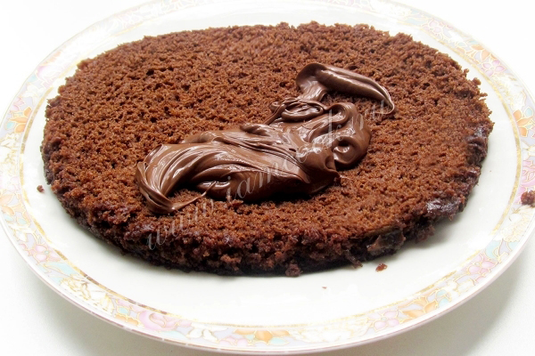 Разрежьте бисквит на 2 равных коржа и смажьте шоколадной пастой. Видите, какой он рыхлый в разрезе.