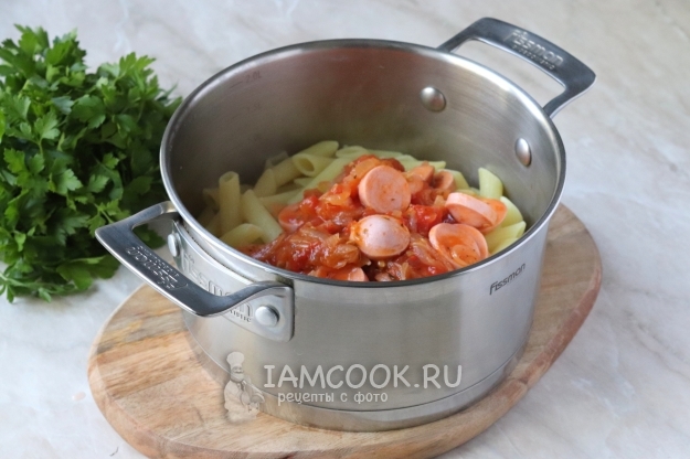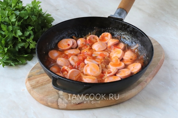 В результате должна получиться очень вкусная томатная подлива с сосисками.