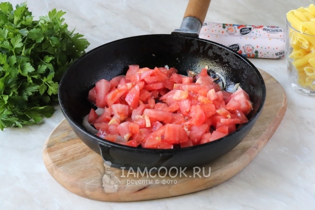 Наличие помидора исключает добавление каких-либо соусов, которые, как правило, подают к макаронным изделиям. Блюдо готовится очень быстро и просто. С ним справится даже начинающая хозяйка.