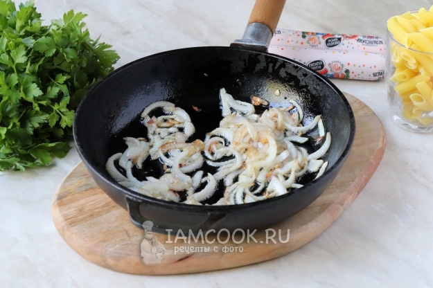 Чистим и режем полукольцами репчатый лук. Разогреваем в сковороде растительное масло и жарим лук до золотистого цвета, периодически помешивая.