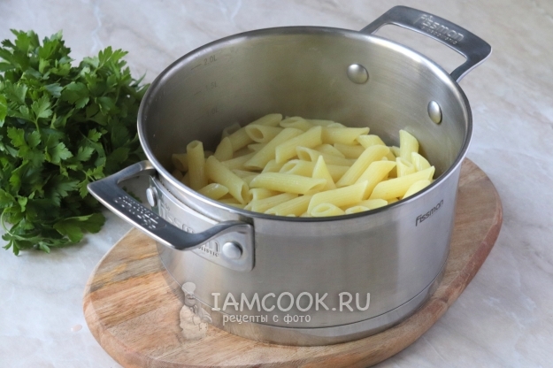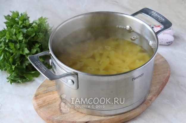 В подходящей кастрюле доводим до кипения воду, солим её и опускаем макароны.