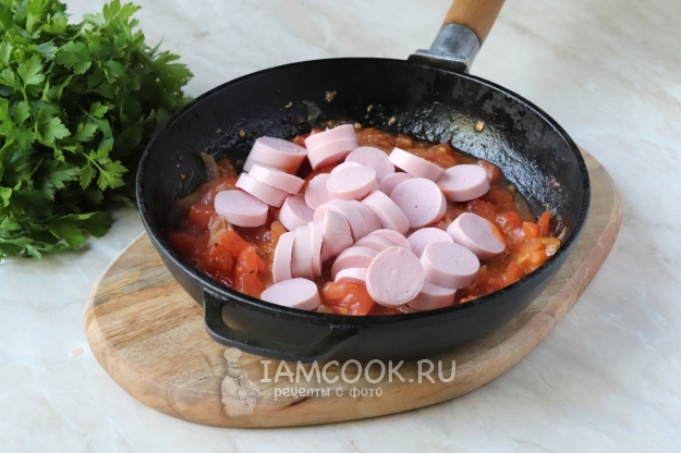 Затем добавляем нарезанные кружочками сосиски и томим на медленном огне ещё пару минут.