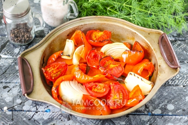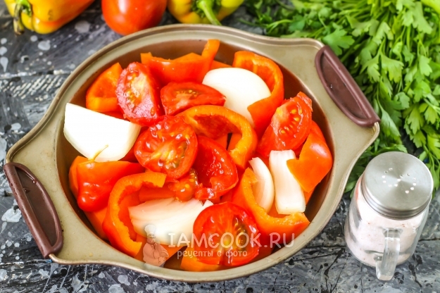 Промойте помидоры в воде, вырежьте сердцевинки и нарежьте на четыре части. Лук очистите, промойте и разрежьте также на четыре части. Болгарский перец очистите от семян, промойте и нарежьте лентами. Выложите все нарезки в форму.