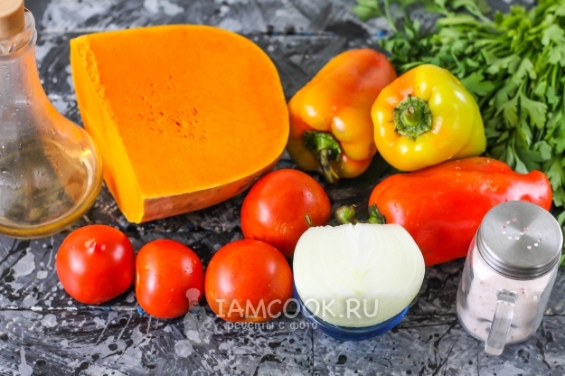 Поместите форму в духовку и запеките овощные нарезки при 200 градусах около 20-25 минут, до мягкости тыквенной нарезки. Помидоры выделят сок, в этом соке запечется тыква.
