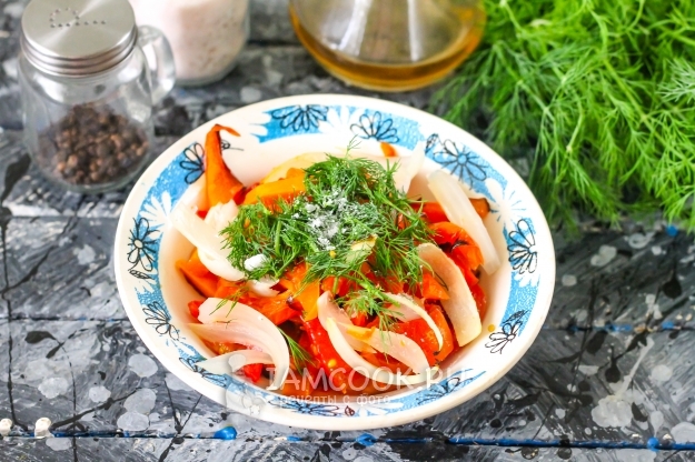 Промойте зелень укропа, измельчите и добавьте в тарелку с овощами, всыпьте соль и перец по вкусу, влейте растительное масло. Аккуратно все перемешайте.