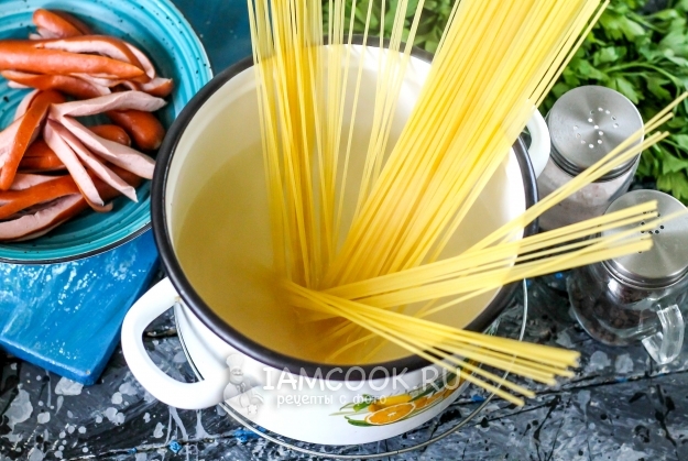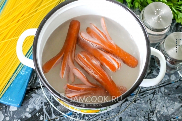 Вскипятите воду в кастрюле и слегка подсолите ее. Выложите заготовки из сосисок в кипяток и отварите в течение 2-3 минут.