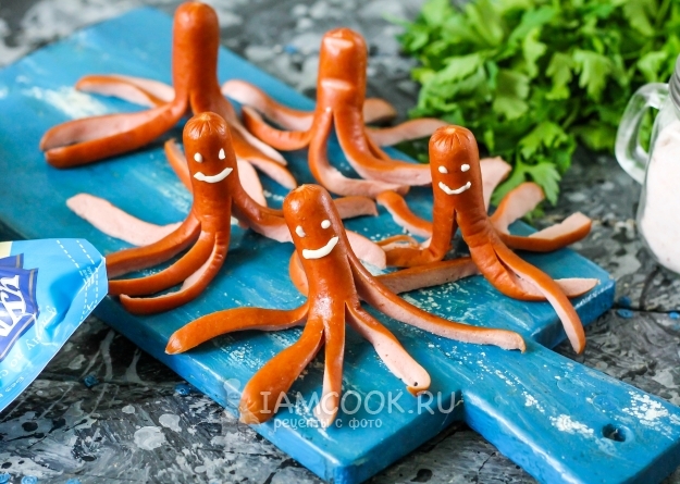 Разложите теплых осьминожек на доске и нарисуйте им рот и глаза майонезом.
