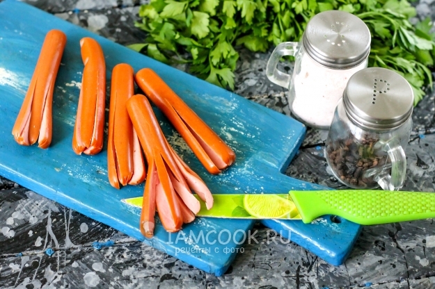 Острым ножом разрежьте каждую сосиску на две части, не дорезая до середины. Затем эти же две части разрежьте еще пополам. Таким образом у вас должна получиться сосиска, с середины разрезанная на четыре части. После еще разрежьте каждую часть пополам, чтобы получились щупальца осьминогов. Они не должны быть слишком тонкими, поэтому если сосиски не крупные, то оставьте четыре щупальца, а если более плотные, то пусть будет их восемь!