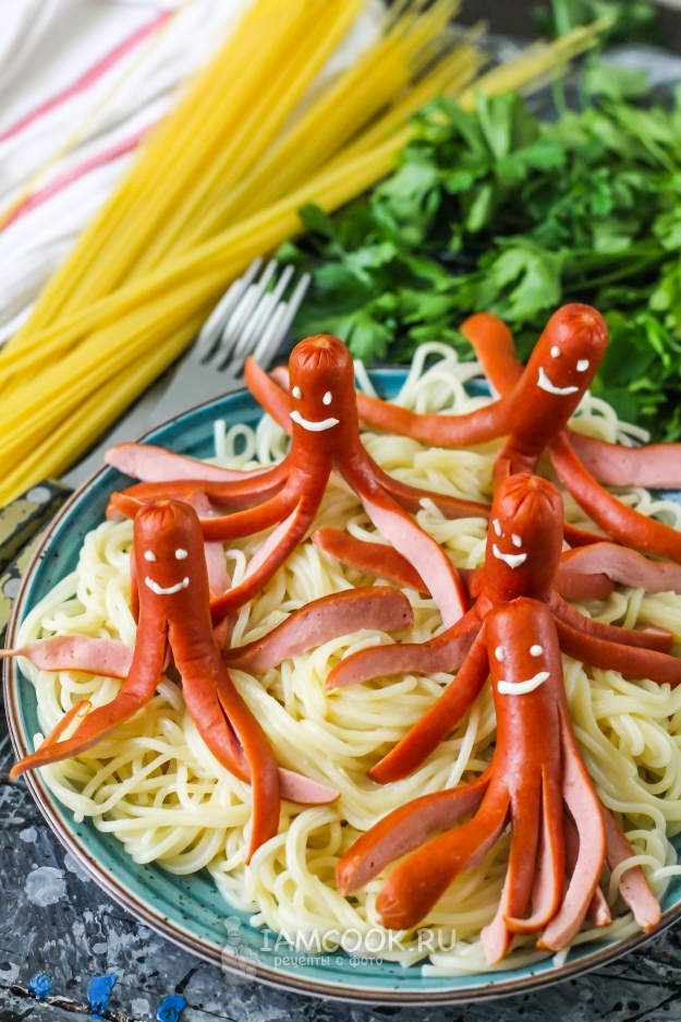 Осьминожки из сосисок и спагетти понравятся вашим детям с первого взгляда! Обязательно привлекайте и их к процессу готовки - дети могут нарисовать глазки и ротик майонезом, заложить разрезанные сосиски в кастрюлю, вынуть их из нее, заложить спагетти, разложить готовых осьминогов на тарелке с пастой! Главное - верить в своих детей и их силы!)))