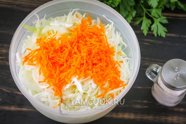 Морковь очистите от кожуры. Промыв в воде, натрите на терке с мелкими ячейками. Выложите на капусту и перемешайте без нажима.