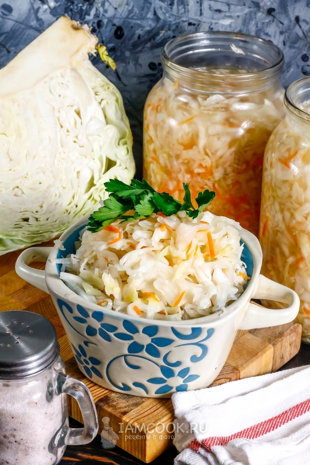 Утрамбуйте всю массу в банки, но сильно не нажимайте, чтобы нарезка осталась хрустящей. В литре холодной воды растворите не йодированную соль. Влейте рассол в банки до плечиков, но не до краев! Потому что в процессе заквашивания уровень жидкости из-за пузырьков углекислого газа будет подниматься и рассол будет выливаться из банки. Поместите емкости на холод, спустя 2-3 дня обязательно выпустите пузырьки из массы на поверхность с помощью деревянной шпажки или спицы. Оставьте заготовку на холоде еще на неделю-полторы, время от времени выпуская пузырьки.