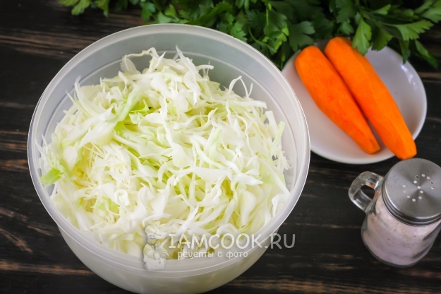 Капусту очистите от верхних листьев, нарежьте лентами и выложите нарезку в миску или таз.