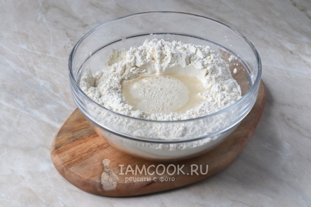 Тщательно перемешайте, сделайте в центре углубление и налейте туда тёплую воду.