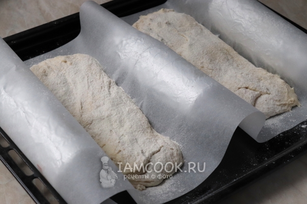 Подготовьте "колыбельку" для будущего хлеба - картонные валики или длинные бутылки из термостойкого стекла обмотайте фольгой и выложите по краям и центру противня, получившуюся конструкцию накройте пергаментом. Переложите тесто, немного растягивая его в длину. Присыпьте пшеничной мукой, накройте полотенцем и оставьте на 1 час при комнатной температуре. Когда наши заготовки "отдохнут", отправьте их в разогретую до 220 градусов духовку.
