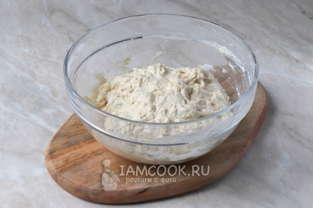 Ложкой размешайте мучную массу. Тесто должно получиться густым и липким. Накройте миску полотенцем или затяните пищевой плёнкой и оставьте при комнатной температуре на 12-15 часов.