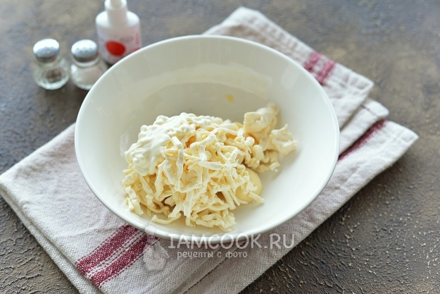 Переложите желтки, натертый плавленый сыр, майонез, соль и перец по вкусу в глубокую миску.