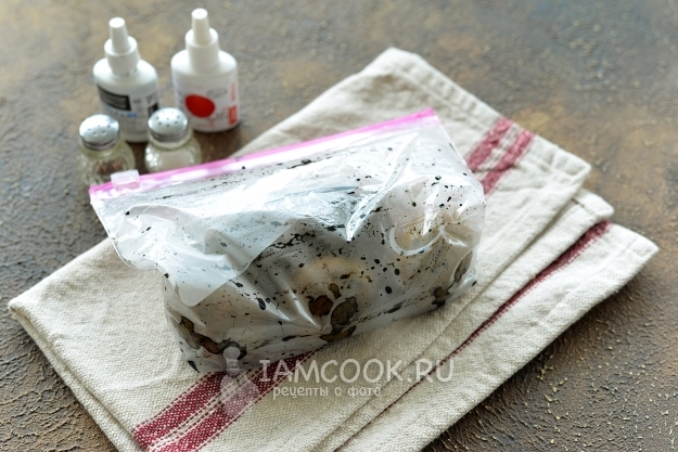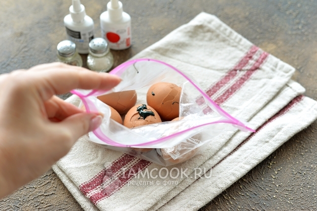 Закройте или завяжите пакет, оставьте яйца в краске на пару часов, время от времени встряхивайте кулек.