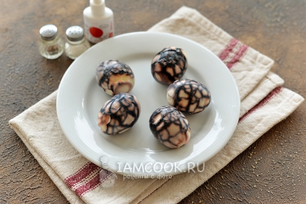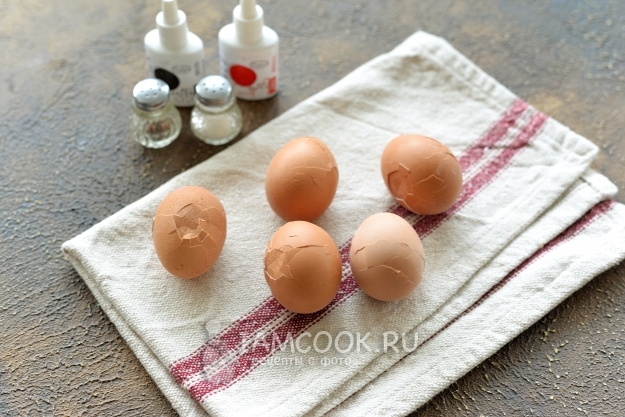 Выньте яйца теплыми из воды, просушите их бумажными полотенцами. Каждое яйцо нужно ударить об стол несколько раз со всех сторон, нужно чтобы скорлупа хорошенько побилась.