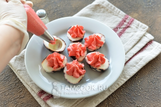 Переложите начинку в кулинарный мешок с насадкой, наполните половинки белка.