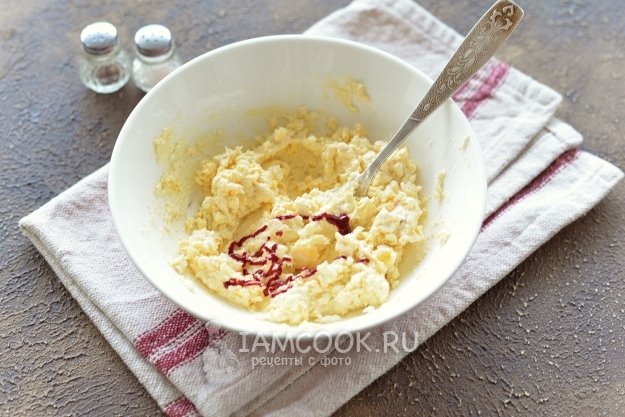 Разотрите начинку до пастообразного состояния, добавьте красный краситель, перемешайте.