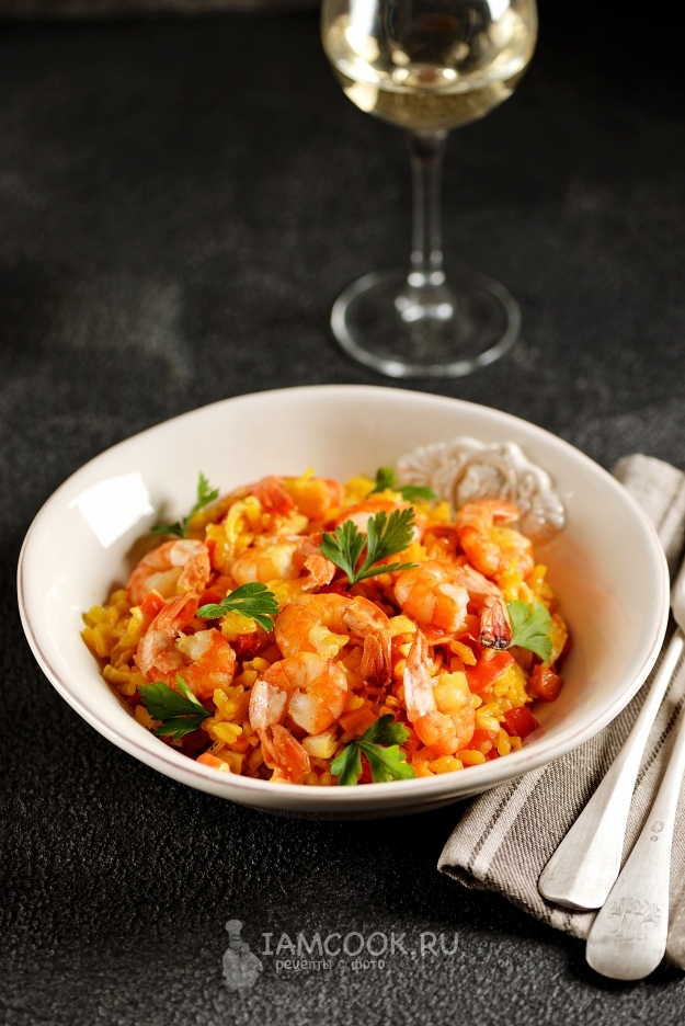 Готовую паэлью с креветками разложите по порциям и подавайте с бокалом белого сухого вина.