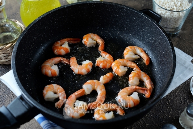 Разогрейте в сковороде немного постного рафинированного масла, обжарьте в нем очищенные от панциря хвосты креветок, не забудьте удалить кишечник. Жарьте креветок буквально пару секунд - нужно, чтобы они только изменили цвет. Снимите их со сковороды.