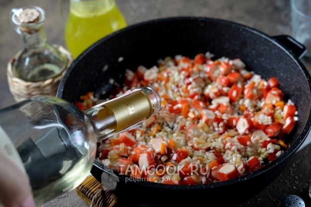 Теперь всыпьте рис. Рис для паэльи, как и для ризотто, не промывают. Обжарьте рис около минуты с овощами, влейте вино.