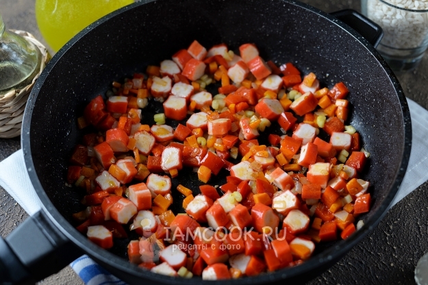 Как только лук и морковь станут слегка мягкими, всыпьте очищенный, мелко нарезанный болгарский перец и сельдерей. Спустя 2-3 минуты добавьте крабовые палочки. Готовьте все вместе еще минуты 3.