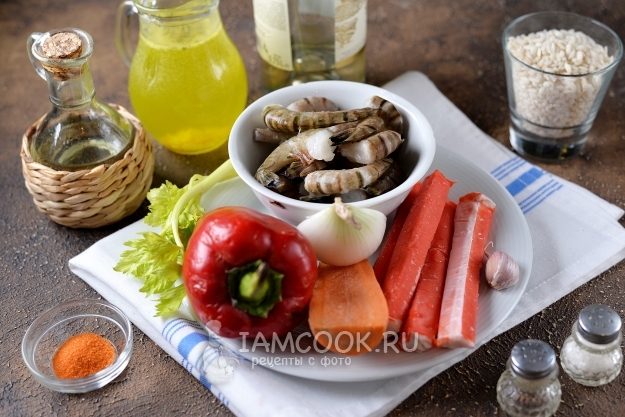 Подготовьте продукты по списку. Креветок и крабовые палочки предварительно разморозьте. Лук, чеснок и морковь очистите, помойте вместе с остальными овощами под проточной водой, обсушите.