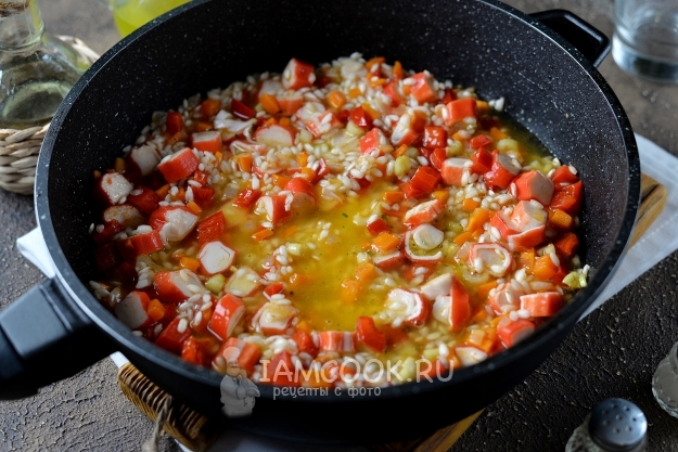 Когда вино испарится, влейте половину бульона, готовьте паэлью минут 10 на тихом огне. За это время бульон полностью испарится.