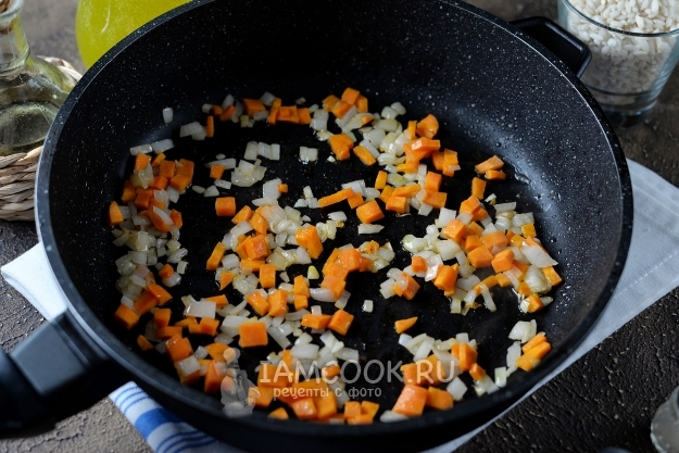 В это же масло выложите очень мелко нарезанный репчатый лук и морковь.