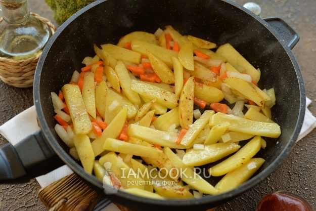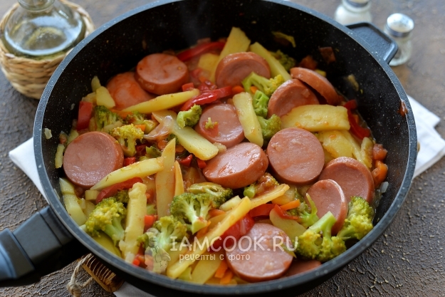 Снимите сардельки со сковороды, в это же масло положите тонко нарезанный картофель, обжарьте его несколько минут до румяной корочки, дальше всыпьте лук и морковь. Сделайте тише огонь под сковородой, жарьте минут 5.