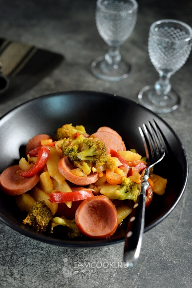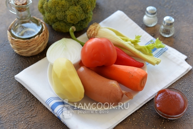 Подготовьте все необходимые ингредиенты для приготовления тушеной брокколи с сардельками и овощами. Картофель, лук и морковь очистите, помойте вместе с остальными овощами.
