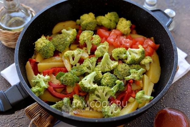 Брокколи разберите на соцветия, добавьте в сковороду вместе с нарезанным мелким кубиком помидором, влейте немного воды, накройте крышкой и тушите все вместе 5-7 минут.