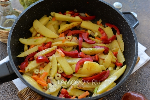 Добавьте мелко нарезанный сельдерей и очищенный болгарский перец соломкой. Тушите еще минут 5.
