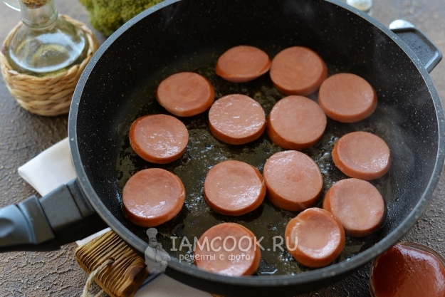 Сардельки нарежьте кружочками толщиной около 0,5 см, обжарьте в небольшом количестве постного рафинированного масла с обеих сторон до румяной корочки. Если сардельки в натуральной оболочке, ее можно не снимать. Кроме того, во время жарки они вывернутся в одну сторону чашечкой и будут симпатично выглядеть в готовом блюде.