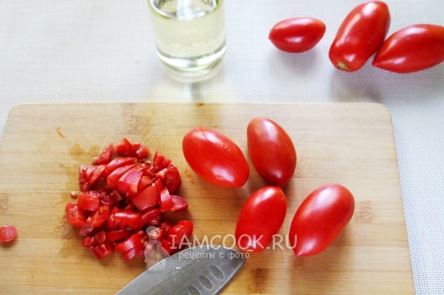 Тем временем мелким кубиком порезать помидоры (при желании их можно измельчить в блендере, если не хотите сохранить фактуру).